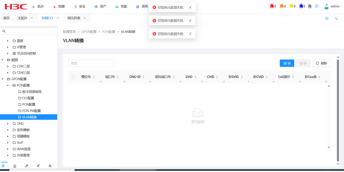 现场网管平台管理p3608,查看olt上配置时发现无法查看vlan转换相关信息,提示获取网元数据失败,但是其他信息是能查看的