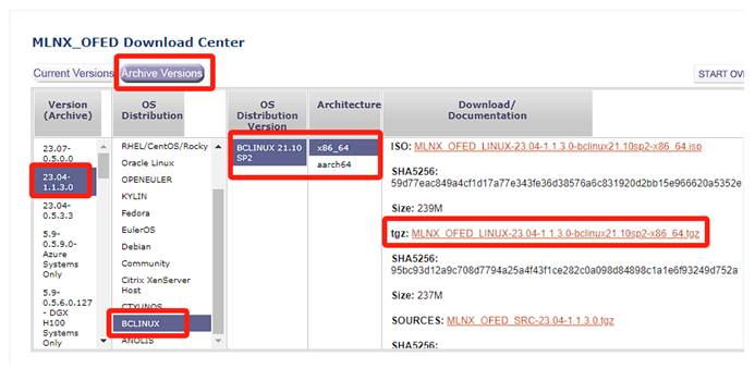 在下载部分驱动时,以阿里SDN要求的5.6-1.0.3.3版本中,BCLinux21.10SP2仅有ARM版本的,X86系统可以下载OpenEuler20.03SP1的驱动,到系统进行二次编译即可,类似如果驱动没有BCLinux7.6版本,但是需要BCLinux7.6时,可以下载CentOS7.6作为平替,在系统进行二次编译即可,下面截图为下载23.04版本BCLinux21.10 X86系统的示例,注意下载时选择tgz结尾的包