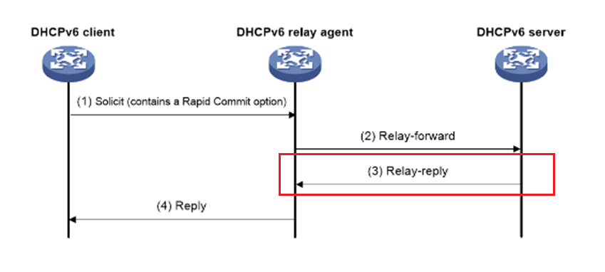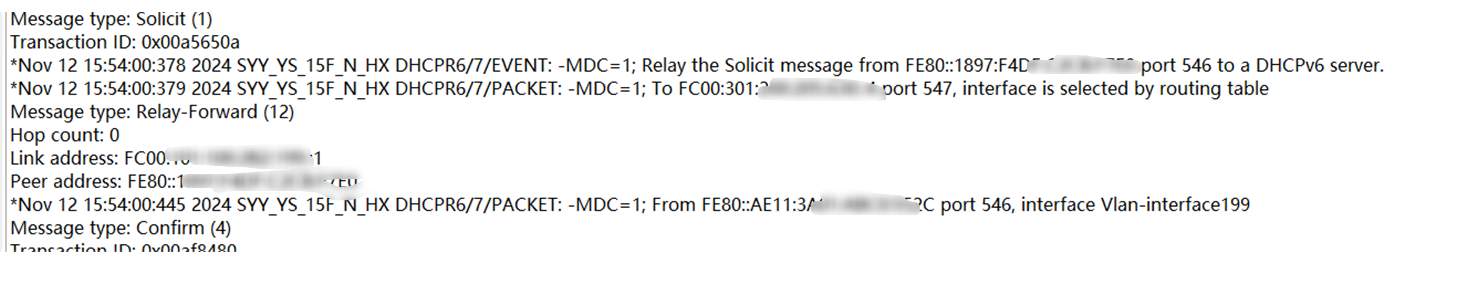 2、在dhcp中继侧debug看报文的话,发现没有收到服务器的relay-replay报文,只收到了solict报文和转发的relay-forward报文,因此怀疑是服务器侧的问题。