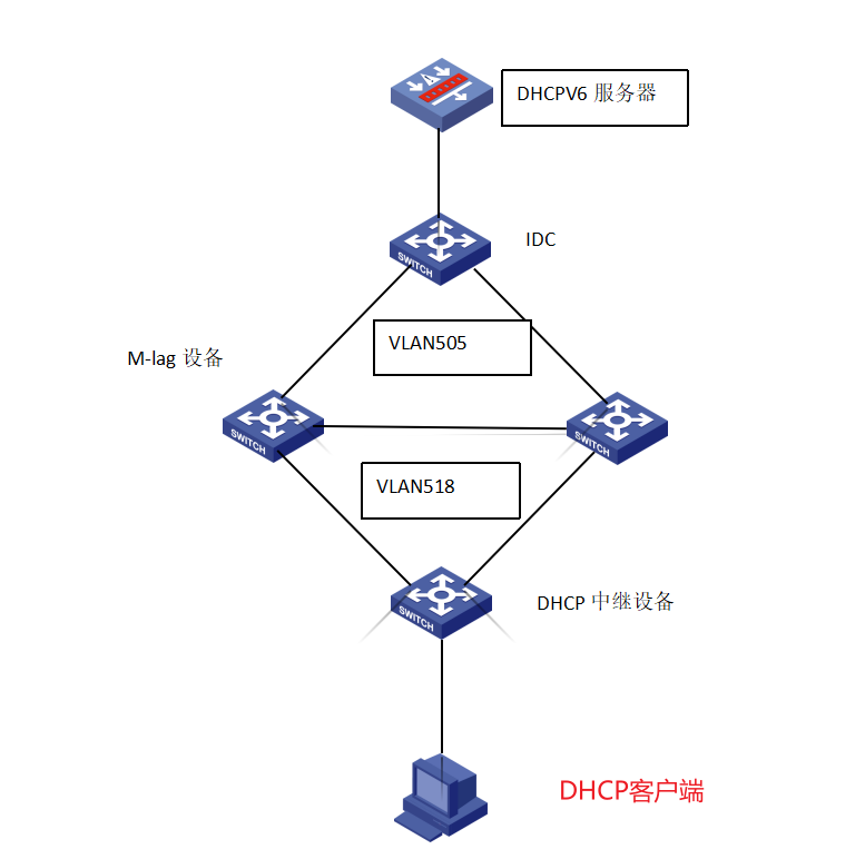 网络拓扑如上,其中m-lag双活ipv6地址上连使用vlan505做ospfv3对接idc侧将dhcpv6服务器的路由引入发给m-lag,下行使用静态路由使得去dhcpv6客户端网关路由可达并将静态引入发给idc,使dhcpv6服务器侧到达终端网关可达。路由部署完成,但dhcpv6终端无法获取到地址。