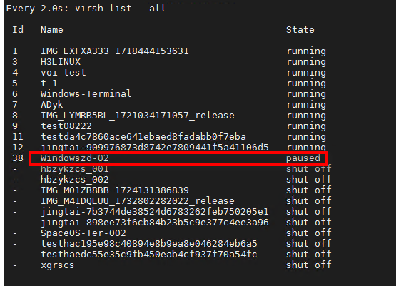 如果上述步骤3看到存在迁移任务,切步骤4看到有pause状态的同名虚拟机,则说明虚拟机迁移的后台任务仍然在进行。