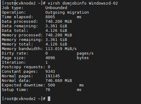 3、在源端虚拟机执行 virsh domjobinfo <domainname>判断是否存在迁移任务