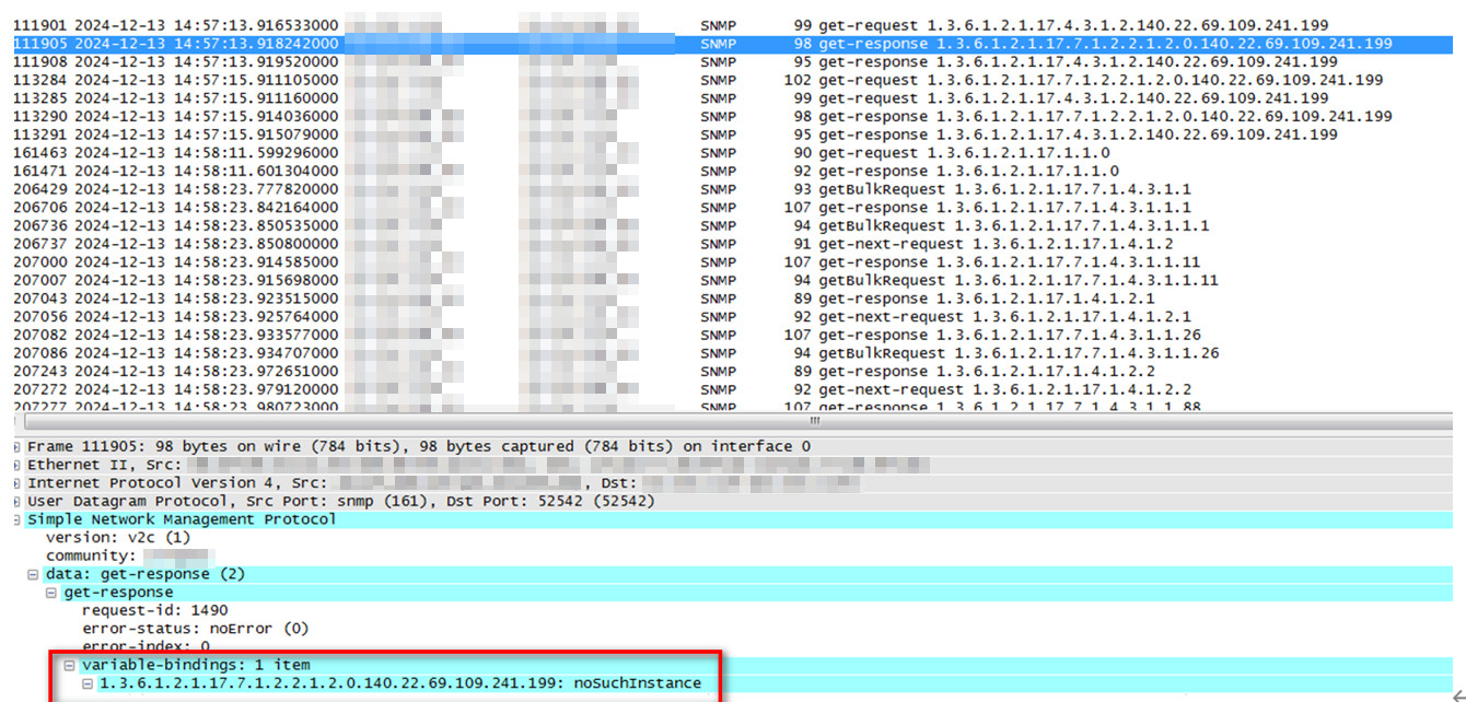 iMC在实时定位时,会通过snmp向设备获取mac表项,根据这个思路在iMC服务器上抓包分析,发现iMC在向设备请求mac表项时,设备侧回了nosuchinstance,即没有这个节点。这种情况下iMC会认为无法准确定位到终端,因此会把所有学到这个mac的设备和对应的接口都列出来,即问题描述中的现象。