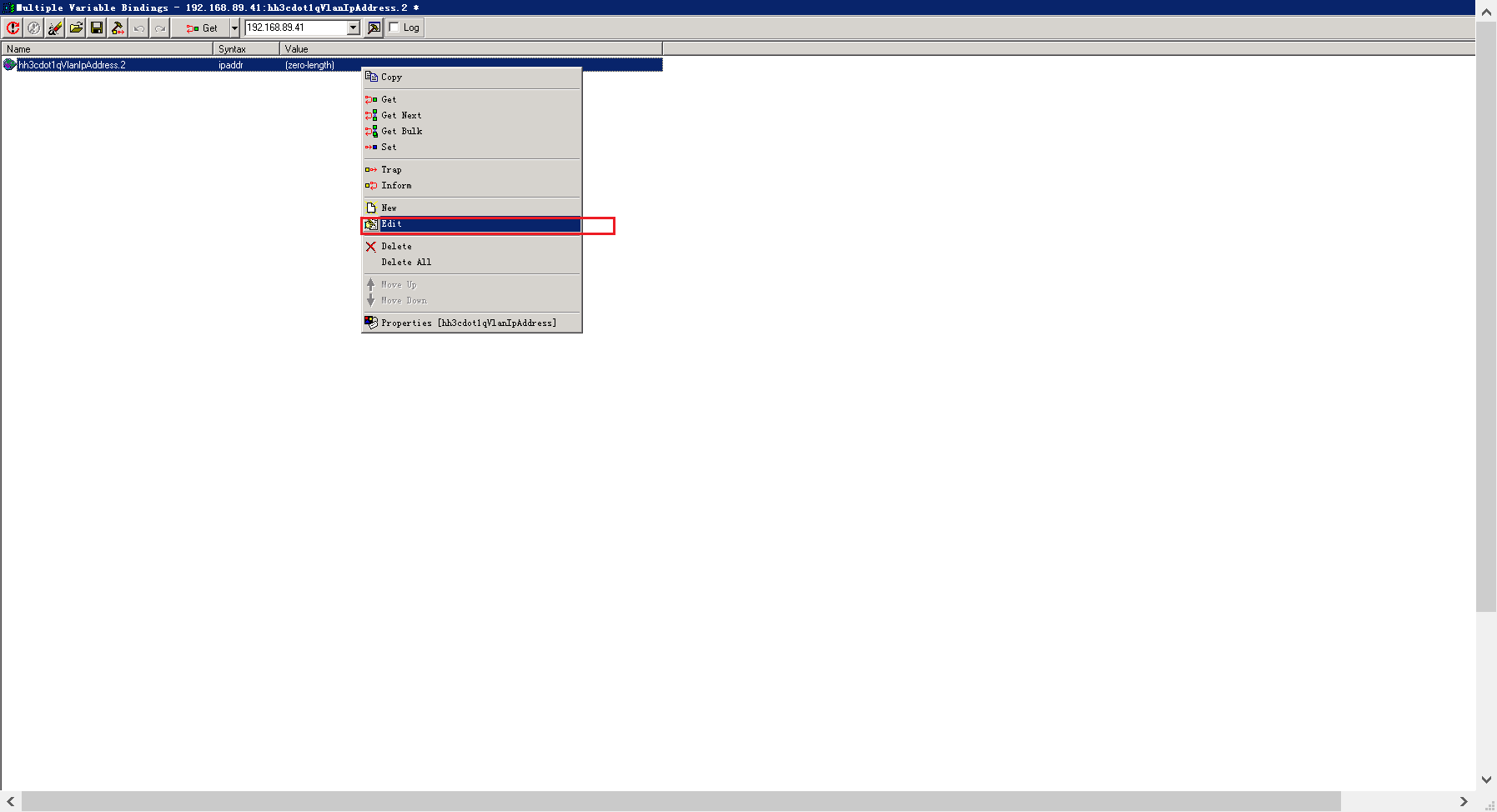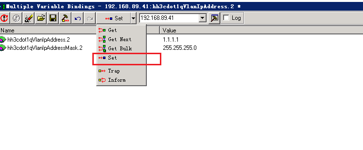 可以在mib工具上对应节点右键找下multiple variable bindings按钮,将这两个节点绑定,输入对应的value后执行:
