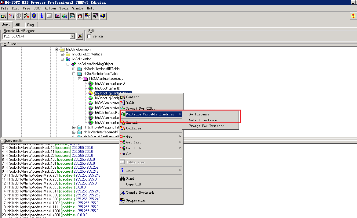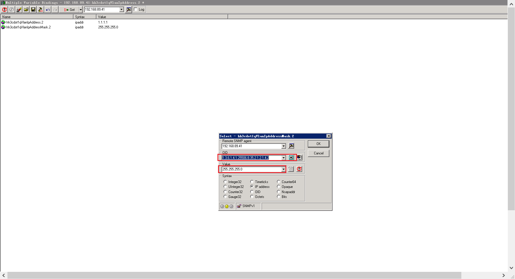 设置操作,hh3cdot1qVlanIpAddress与hh3cdot1qVlanIpAddressMask必须同时输入。