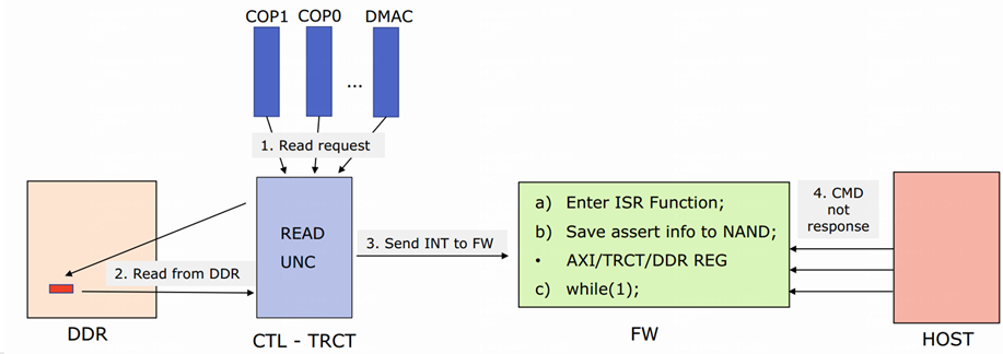 详细故障模式介绍:长存SSD 固件(FW) 中设置许多的 Assert(断言),对应不同的工作异常状态,选择性进入处理,Assert 的作用可以避免程序在异常状况下运行恶化。Assert 245 是FW 在检测到 DDR/SRAM 读写过程校验出错时的处理函数,FW 在存储完 Assert Info 后会直接卡 while(1),进入死循环,使 FW 无法继续运行和响应 Host 命令。此时如硬盘和Raid卡之间读写IO有未完成的 Host CMD,则会出现 CMD TimeOut现象,对于后续 Host 新下的 CMD,SSD 也将无法接收和执行,会出现掉盘的现象。