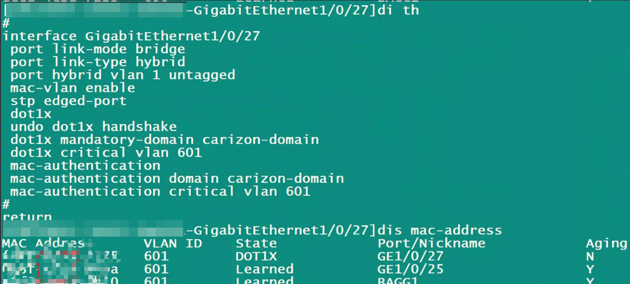*DOT1X/7/EVENT: User aging timer expired: UserMAC=xxxx-xxxx-xx75, VLANID=601, Interface=GigabitEthernet1/0/27.