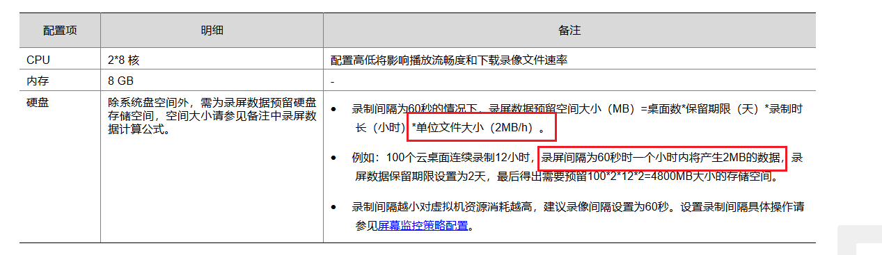 7. 录制间隔为60秒的情况下单位文件大小为2MB/h。录制间隔如果设置为1s,单位文件大小增加60倍。开了录制,虚拟机内有个程序到达间隔设置的时间就截屏并发送给录屏服务器,设置的时间短,这个程序就操作频繁,消耗虚拟机的资源多。建议录像间隔设置为60秒。