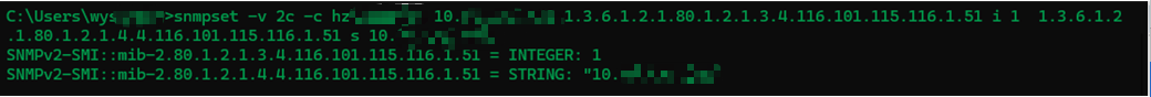 snmpset -v 2c -c hzlabxxxx 10.X.X.X 1.3.6.1.2.1.80.1.2.1.18.4.116.101.115.116.1.51 i 1 1.3.6.1.2.1.80.1.2.1.19.4.116.101.115.116.1.51 s 10.X.X.X