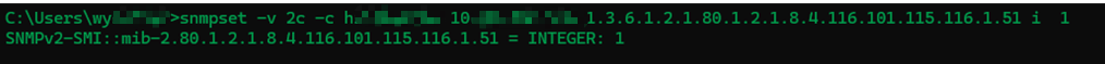snmpset -v 2c -c hzlabxxxx 10.X.X.X 1.3.6.1.2.1.80.1.2.1.8.4.116.101.115.116.1.51 i 1
