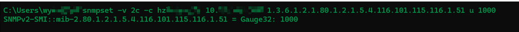 snmpset -v 2c -c hzlabxxxx 10.X.X.X 1.3.6.1.2.1.80.1.2.1.5.4.116.101.115.116.1.51 u 1000