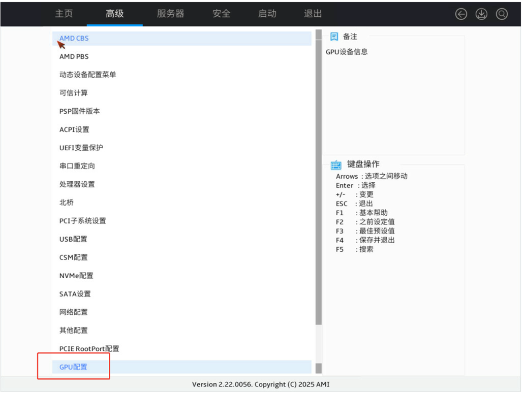 AMD G6系列异构服务器: BIOS 升级6.30.37以后版本可在BIOS-高级-GPU配置界面显示GPU型号
