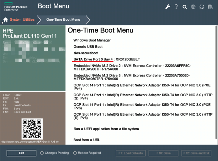 在配置了嵌入式 SATA M.2 硬盘的 HPE ProLiant Gen11 服务器上,如果一次性启动菜单(One-Time Boot Menu)中显示的嵌入式 SATA M.2 硬盘设备字符串不正确,则会显示为 "SATA Drive Port # Bay #"(即带有 Port 和 Bay 编号的字符串)