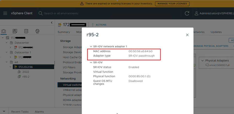 任何运行 VMware ESXi 8.0 并配置 HPE Synergy 6310C 25/50Gb 以太网卡的 HPE Synergy 480 Gen11/Gen12 计算模块,均不支持带有 VLAN 标记的SR-IOV。当虚拟机 (VM) 配置使用 SR-IOV 的 VLAN 直通网卡时,该虚拟机将无法获取 VLAN IP 地址,并且无法成功 ping 通。