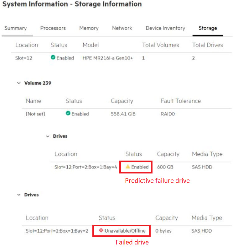 处于预故障或故障状态的硬盘会在 iLO 存储信息页面中显示正确的状态。