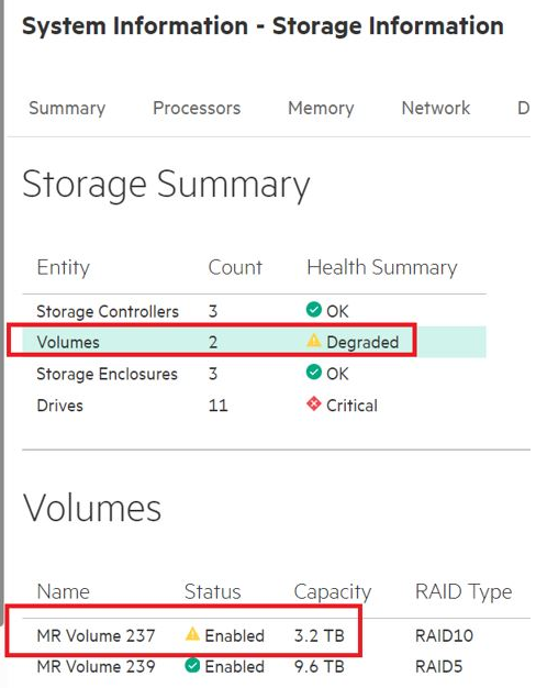 连接到 HPE MR Gen10 Plus/Gen11 控制器时,存储卷显示降级状态,卷状态在iLO存储信息页面上变为“warning”, 但在iLO Web->Server Health -> Storage选项卡中错误地显示为“OK”。