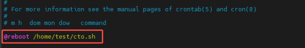 //进入编辑,输入:@reboot /home/test/cto.sh,其中/home/test/cto.sh为脚本路径