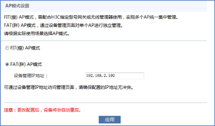 设置AP的工作模式为FAT AP模式,并修改设备的管理IP地址。设置完成后,设备会自动重启,重启后您需要通过新配置的管理IP地址重新登录