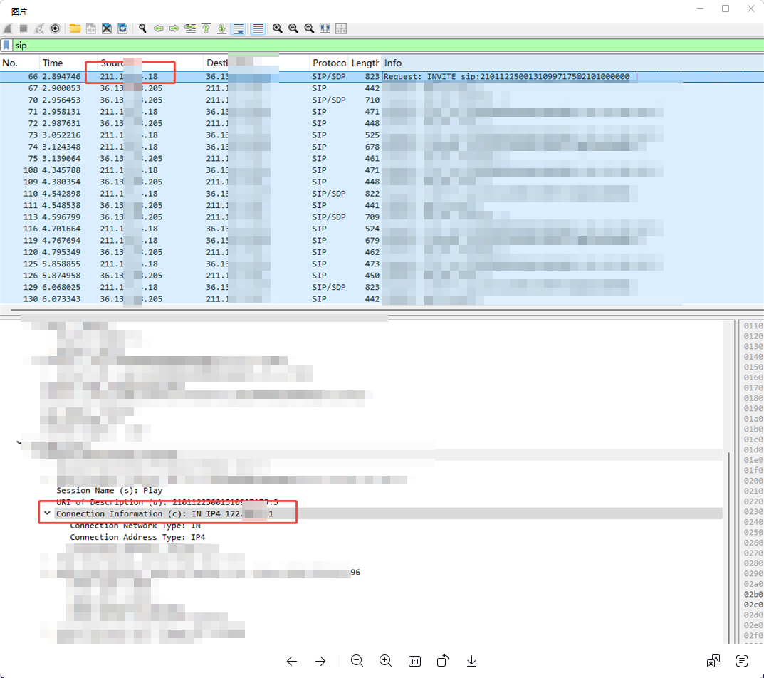 2. 抓包分析,发现nat后的信令传输报文的报问体有问题,数据通道的ip未转换成公网地址。