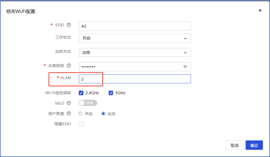 创建第一个wifi,ssid名称是A2,桥接业务vlan2