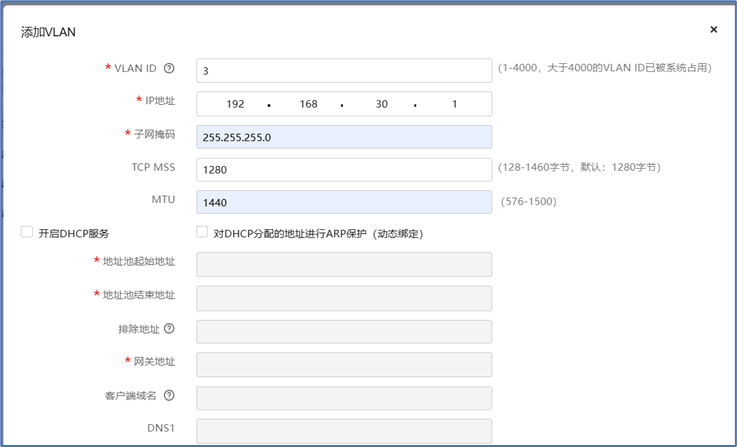 network 192.168.30.0 mask 255.255.255.0 //配置DHCP地址池vlan3动态分配的地址网段为192.168.30.0/24