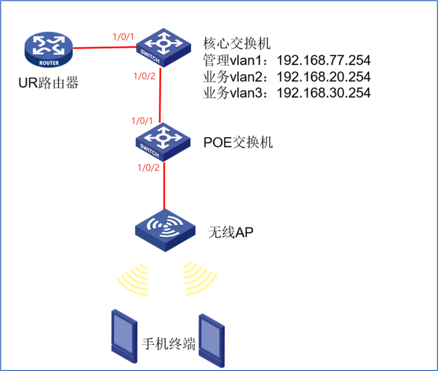 UR 路由器旁挂核心,核心下发地址,管理vlan和业务vlan分开 ,POE交换机为AP供电