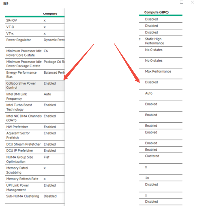 由于正常与异常设备唯一的差别就是异常设备调整过Workload Profile,从General Power Efficient Compute改为High Performance Compute,所以对比两种配置的差别,确认与CPU频率有关的选项指向Collaborative Power Control