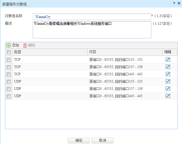 b、在需要防护的源/目的安全域之间,创建安全策略阻断WannaCry服务组。