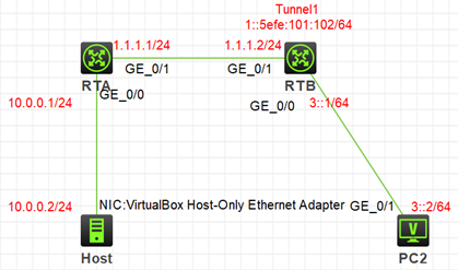 第一个实验:ISATAP隧道配置实验,在Host和RTB之间搭建了ISATAP隧道,之后发现Host只能ping通RTB的G0/0接口地址3::1/64,但是无法ping通PC2的地址3::2/64;RTB和PC2之间是可以互相ping通的;