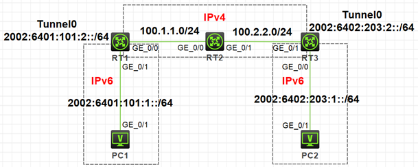 第二个实验:6to4隧道实验,在RT1和RT2之间搭建6to4隧道,之后PC1能ping通RT1,PC2能ping通RT2,RT1和RT2与PC互连接口带源互相ping也能够ping通,但是PC1和PC2之间就是不能互相ping通。
