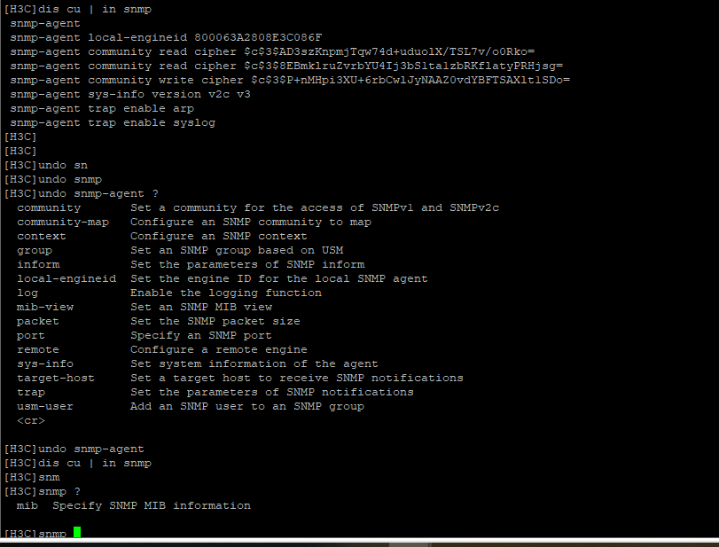 关了snmp-agent后,snmp都没了,重新配置还需要开启snmp-agent,配置还是原来的,undo snmp-agent community cipher $c$3$JZotAS4VmPnH01FWL/qFrcbL0CO2tm/ajjE= 这样删除掉了