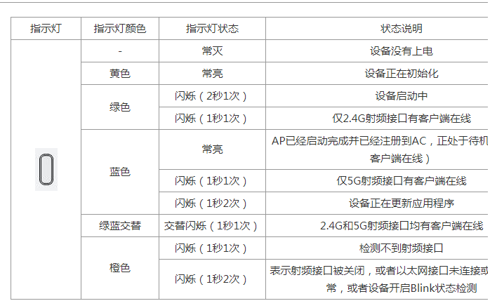 如果你有多个AP的 话,你的终端可能连接的其它的AP,指示灯为黄色状态非正常工作状态,应该是还没起来,处于初始化阶段,ap启动完后,2.4G终端连接上后,指示灯显示绿色,5G连接后,指示灯显示黄色,黄绿交替,说明两个频段的终端都有连接,AP指示灯说明如下: