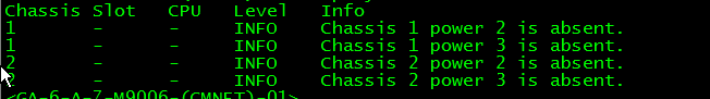 display alarm Chassis Slot CPU Level Info 1 - - INFO Chassis 1 power 2 is absent. 1 - - INFO Chassis 1 power 3 is absent. 2 - - INFO Chassis 2 power 2 is absent. 2 - - INFO Chassis 2 power 3 is absent.
