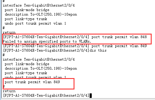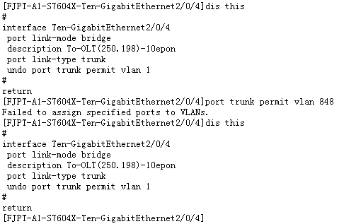 在S7604X的Slot2-LSUM1TGS16SF0板卡的端口上配置成trunk口然后透传VLAN848,配置不生效。