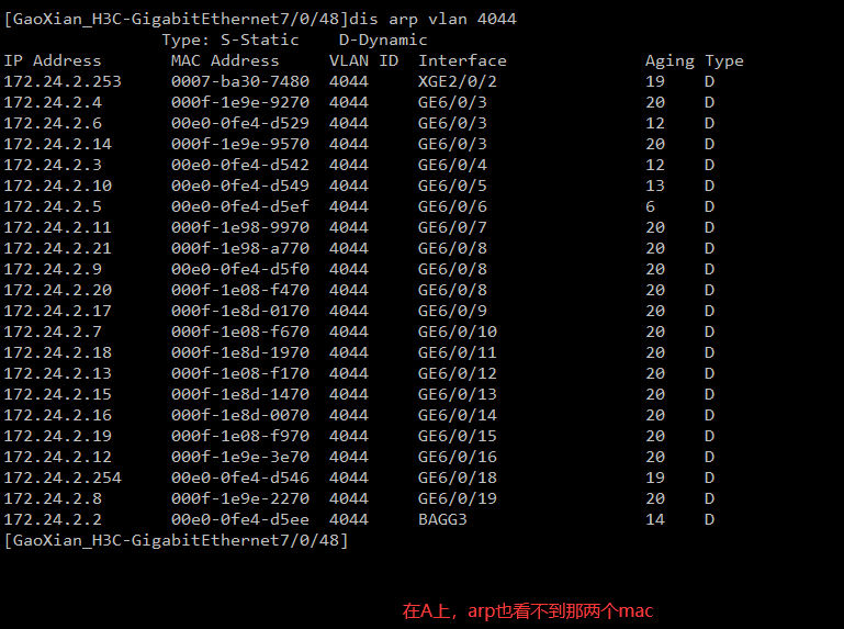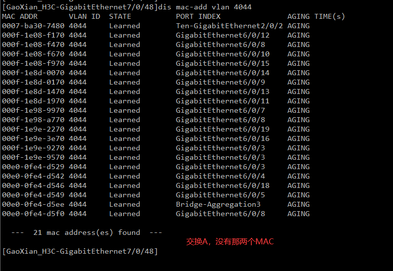 核心汇聚A交换机(7606)下的GIGA 6/0/3,接了一个汇聚交换机B(6520)xge 1/0/40,在B上dis mac-add ,发现很多vlan里都有两个相同的mac地址(0cda.415c.27ec和0cda.415c.27ed),来自于B的上联口,但在A下dis mac-add,却没有这两个mac 。这两个MAC地址是哪儿来的?压缩包的文件是A和B的MAC表,在B搜索27E就能查到30个。