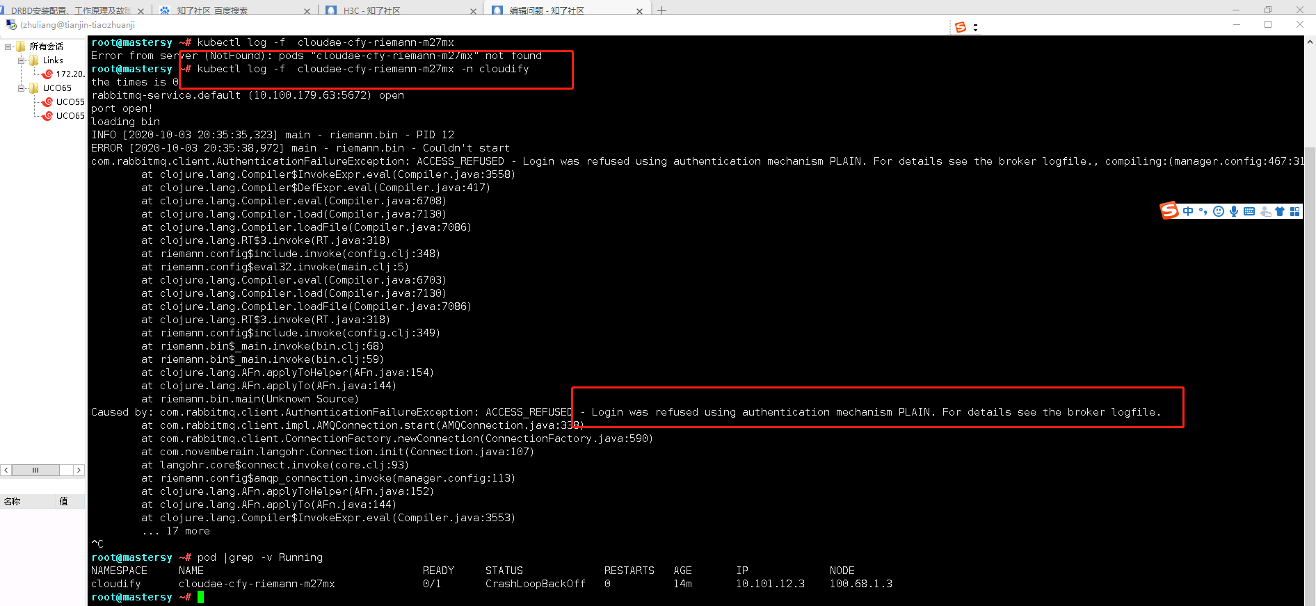 cloudos 上 ,cloudify 名字空间下,有 cloudae-cfy-riemann-m27mx 这个pod 一直反复重启 ,查看这个日志看起来跟rabbiq 有关。 这个pod 是做什么用的 ,怎么解决一直重启的问题