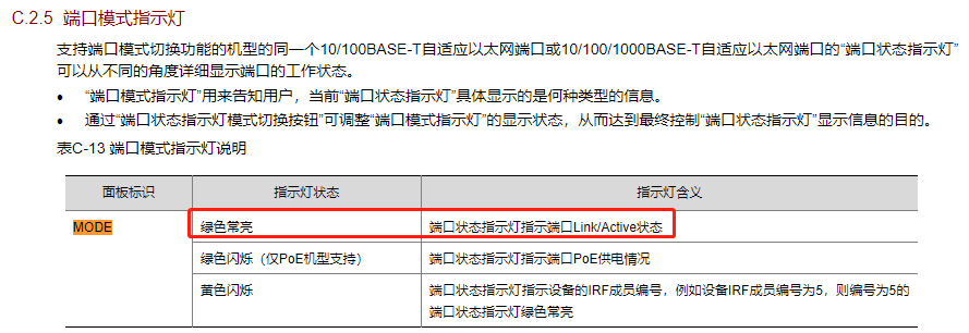 表C-13 端口模式指示灯说明