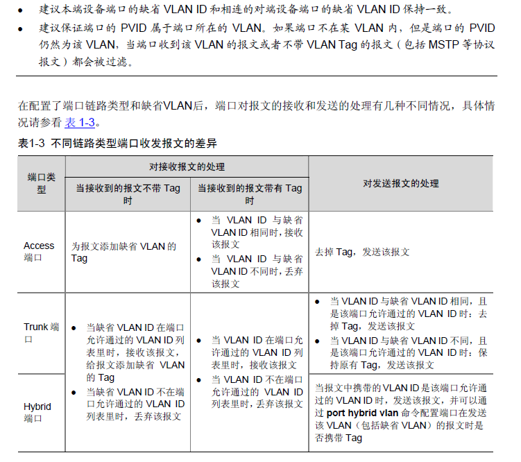 配置缺省 VLAN 后,必须使用port hybrid vlan 命令配置允许缺省VLAN 的报文通过,出接口才能转发缺省VLAN 的报文。