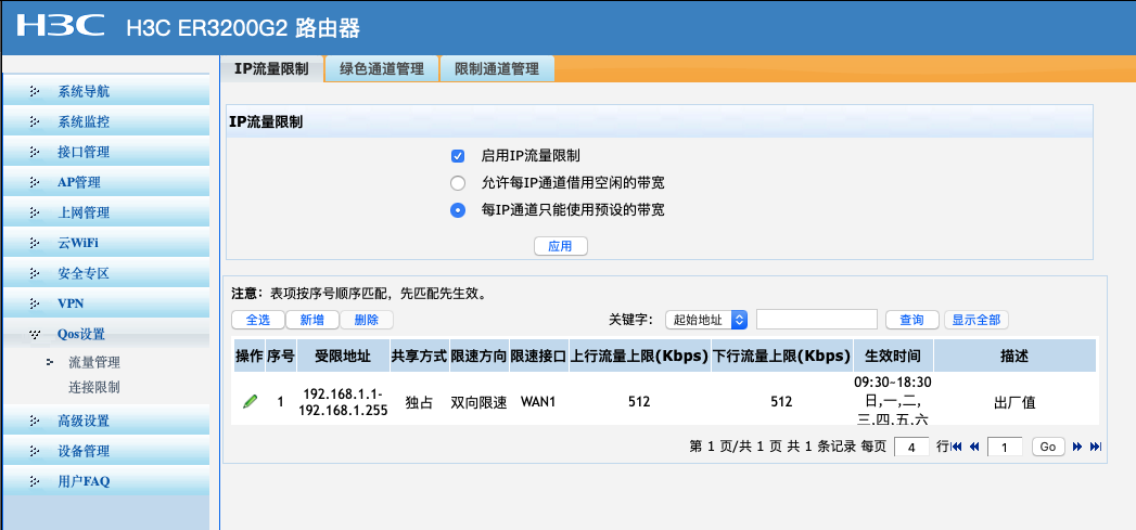 我们公司使用H3C的ER3200G2作为路由器。最近发现“IP流量限制”和一个被命名为“出厂值”的表项会被自动的设上,如下图。