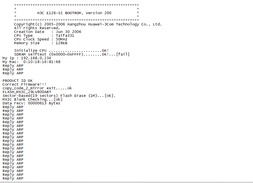 H3C E126-SI  之前没有固件信息,现在从官网上下了固件版本是E126-SI-R0007.bin 。 在此过程中升级一直到一半后停止,谷歌浏览器页面打不开,重新打开一个页面输入地址后,显示直接是重新点击固件在升级,此操作一直循环。
