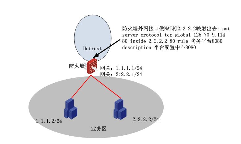 可以把配置贴出来看一下吗?因为防火墙所有的端口都属于local域,你没有配置local和业务区的安全策略,所以我认为你的第二个配置:“安全策略:业务区-业务区 放通any到any 用nat地址125.70.9.114就可以访问.”,也应该不通。