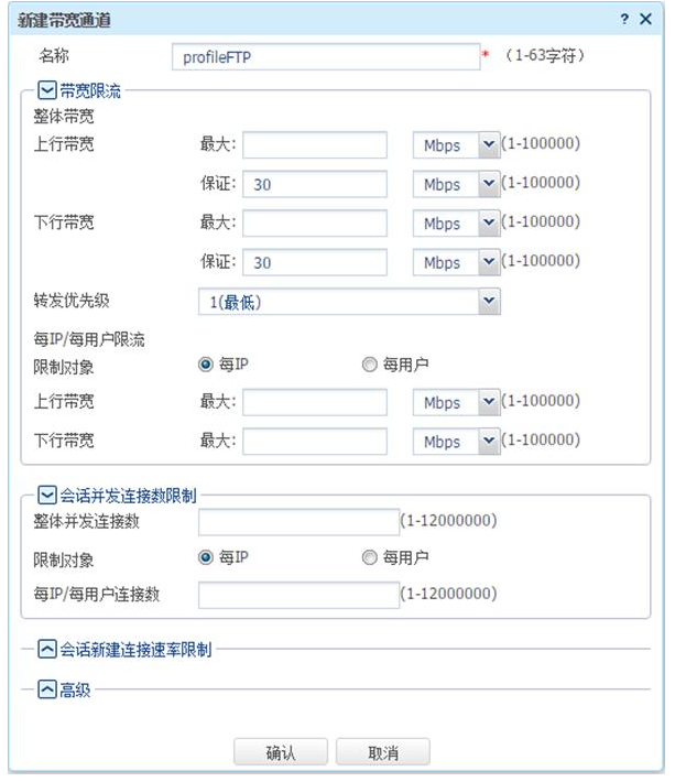 # 按照同样的步骤,添加带宽通道profileFTP,配置如下。