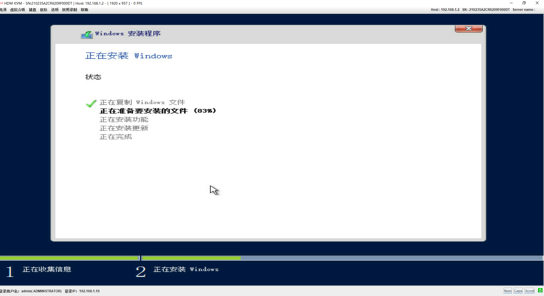 因为这个文件展开是HDM的虚拟介质上边展开边上传的,所以速度非常慢,用U盘安装则是系统文件已经拷贝到硬盘,在硬盘直接展开的