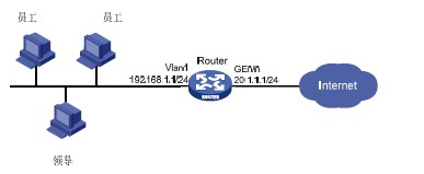 如 图1 所示,公司从ISP购买了20.1.1.1/24 的IP地址用于访问Internet,带宽为50Mbps。为了不影响公司的主营网络业务,需要对用户在工作时间进行带宽控制。具体需求如下: