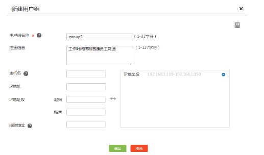 # 选择“上网行为管理 > 用户组”,单击<添加>按钮,进入添加用户组界面,参数配置如下图所示。
