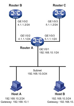 Router A分别与Router B和Router C直连(保证Router B和Router C之间路由完全不可达)。通过策略路由控制从Router A的以太网接口GigabitEthernet1/0/1接收的报文: