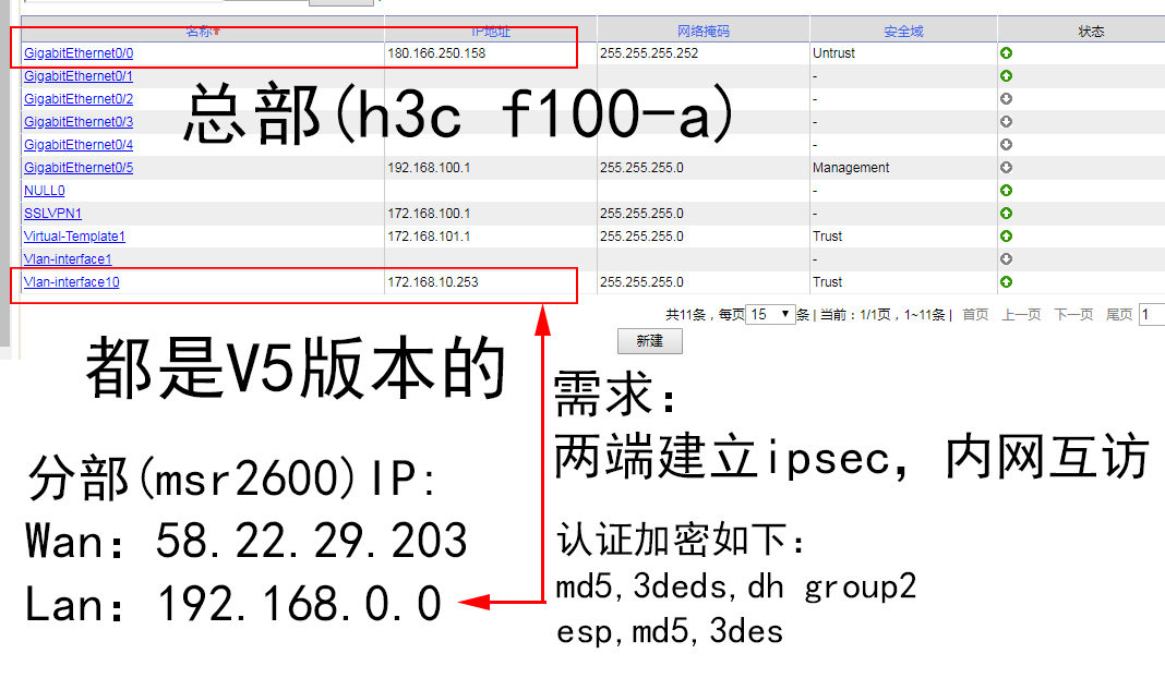 异地两端想弄个ipsec,总部是f100-a,分部是msr2600,都是v5版本,之前在msr和er里用web配置成功,但是在f100-a里配置不成功,请帮我写个命令吧