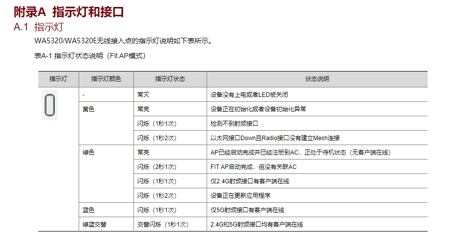 EWP-WA5320-FIT指示灯有三种颜色,分别啥意思,蓝色橙色绿色
