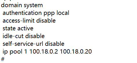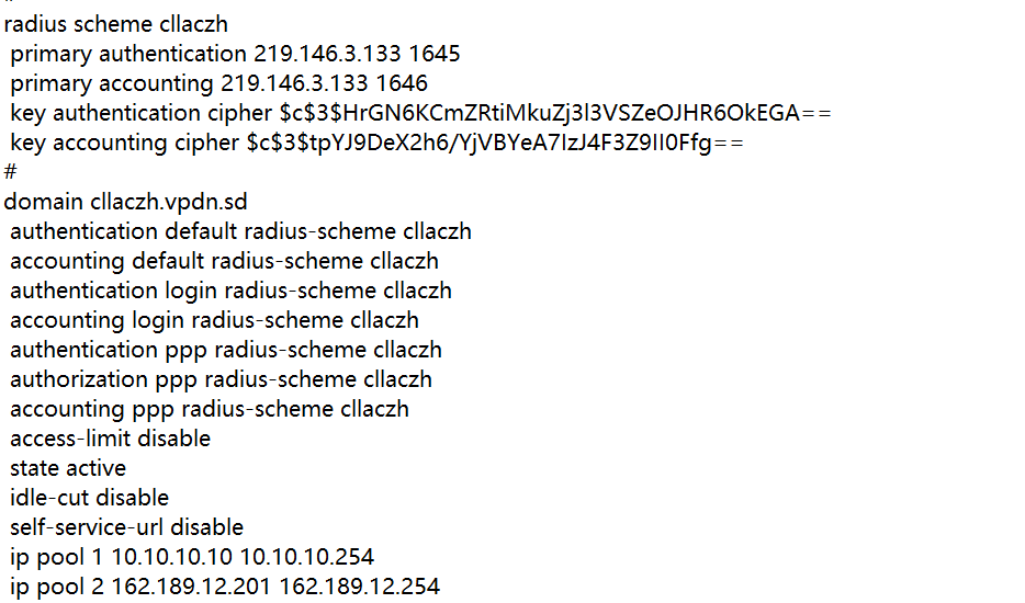他不是本地认证的,他本地就local-user admin password cipher $c$3$anGSgNAHMiCCd0aNkfNxjneXpwMi0DHk authorization-attribute level 3 service-type telnet service-type web local-user system password cipher $c$3$KX4ubnq93jitGy+8za9F7qhA38y3zgOS1w== service-type ppp local-user weihu password cipher $c$3$tqJ3Rv9TgiURHnDzuzr/Q5MTq21O2y273/E0 authorization-attribute level 3 service-type telnet #这三个账户,他应该调用cllaczh.vpdn.sd这个域才对啊