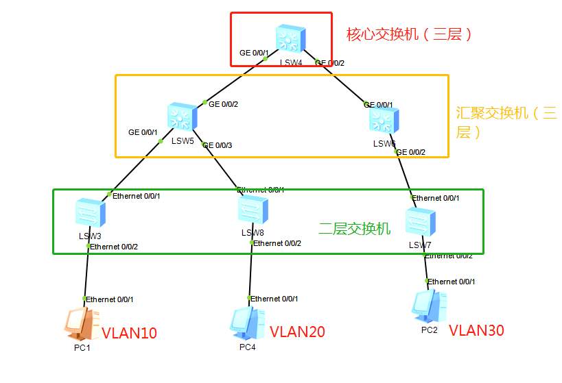 1、如果网关在汇聚上,接入和汇聚都创建VLAN,并trunk互联,在接入上配置vlan access到端口,汇聚上配置VLAN IP。汇聚与核心配置三层互联及路由发布或指向。